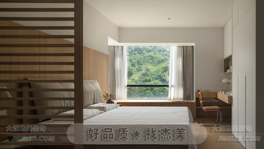 臥室延續(xù)了自然溫暖的色調(diào),木色沿著墻壁與地面蔓延至窗邊,通透的窗扇成為感知四季的窗口。柔軟的光被紗簾篩碎,撒在窗邊,靜下心來感受風(fēng)的流動,獨享靜謐時光,如同詩人在月光下獨酌,享受著孤獨的美好。