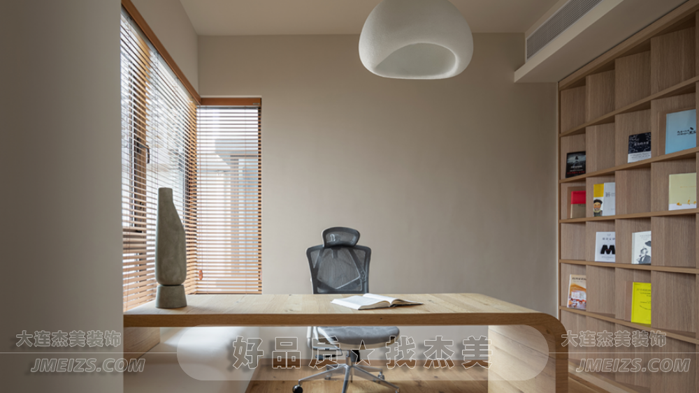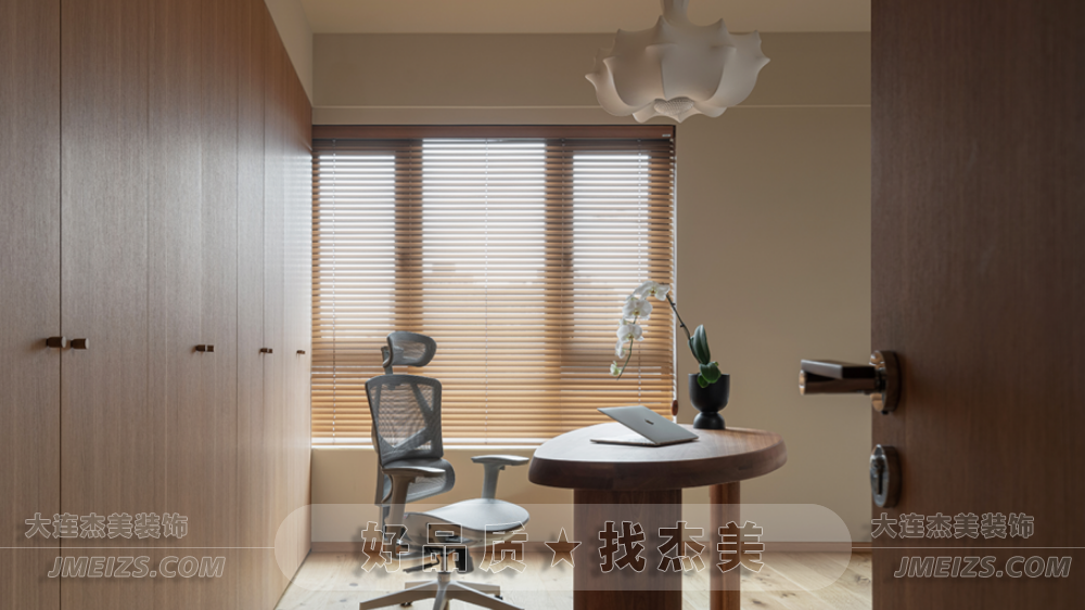 整個(gè)主臥的設(shè)計(jì)都圍繞原木風(fēng)格進(jìn)行。原木色的百葉窗為空間增添了一絲自然和溫馨,而桃花芯木制成的書桌則為其增添了一絲柔和和雅致。