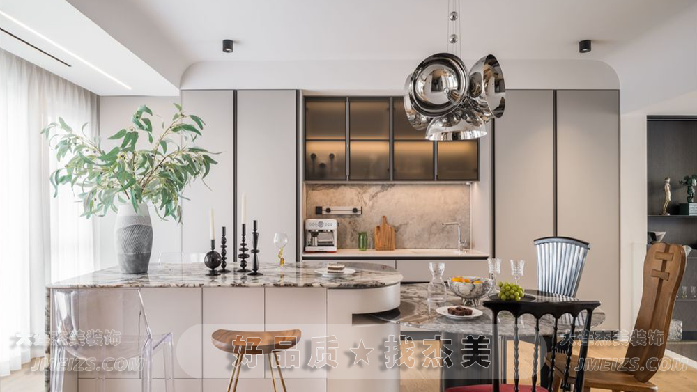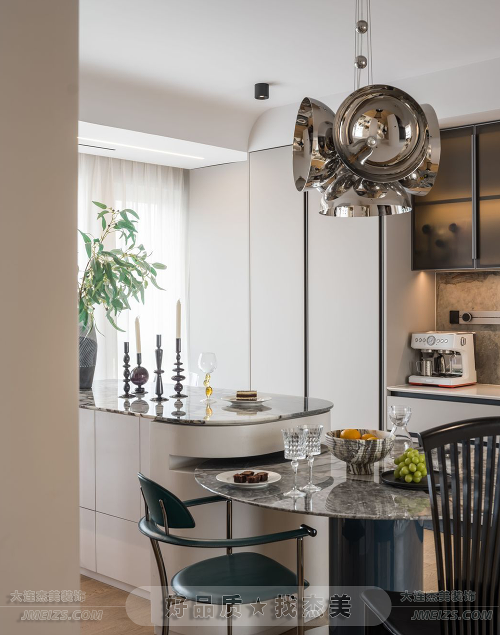 餐廳的設(shè)計充分考慮了中國人的飲食習(xí)慣和西式的中島設(shè)計。設(shè)計師巧妙地將島臺和圓桌結(jié)合,既能滿足家庭聚餐的需要,也能作為西廚和水吧臺使用。這種多功能性的設(shè)計使餐廳不僅僅是用餐的地方,更是家人之間愛與分享的空間。