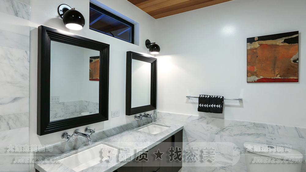 浴室各區(qū)功能明確,洗漱區(qū)、淋浴區(qū)、按摩浴區(qū)區(qū)分明確,又布局合理。大面鏡提升空間感。