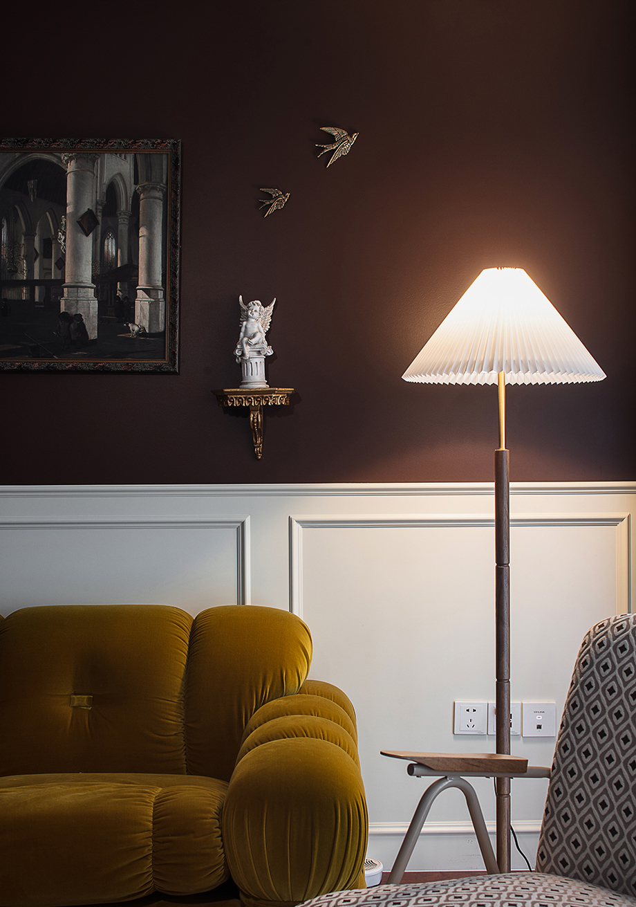 客廳改造前的豬肝色地板為復(fù)古風(fēng)帶來(lái)靈感,拆除原有的沙發(fā)背景墻后,為與原硬裝風(fēng)格更匹配,且避免色彩過(guò)重,采用白色半墻護(hù)墻。客廳大膽且開放的色彩搭配,呈現(xiàn)出有序的質(zhì)感空間。復(fù)古的磚紅色背景墻與大量深色木質(zhì)家具及地板相呼應(yīng),設(shè)計(jì)感的絲絨沙發(fā)與復(fù)古組合掛畫,更凸顯復(fù)古韻味。
