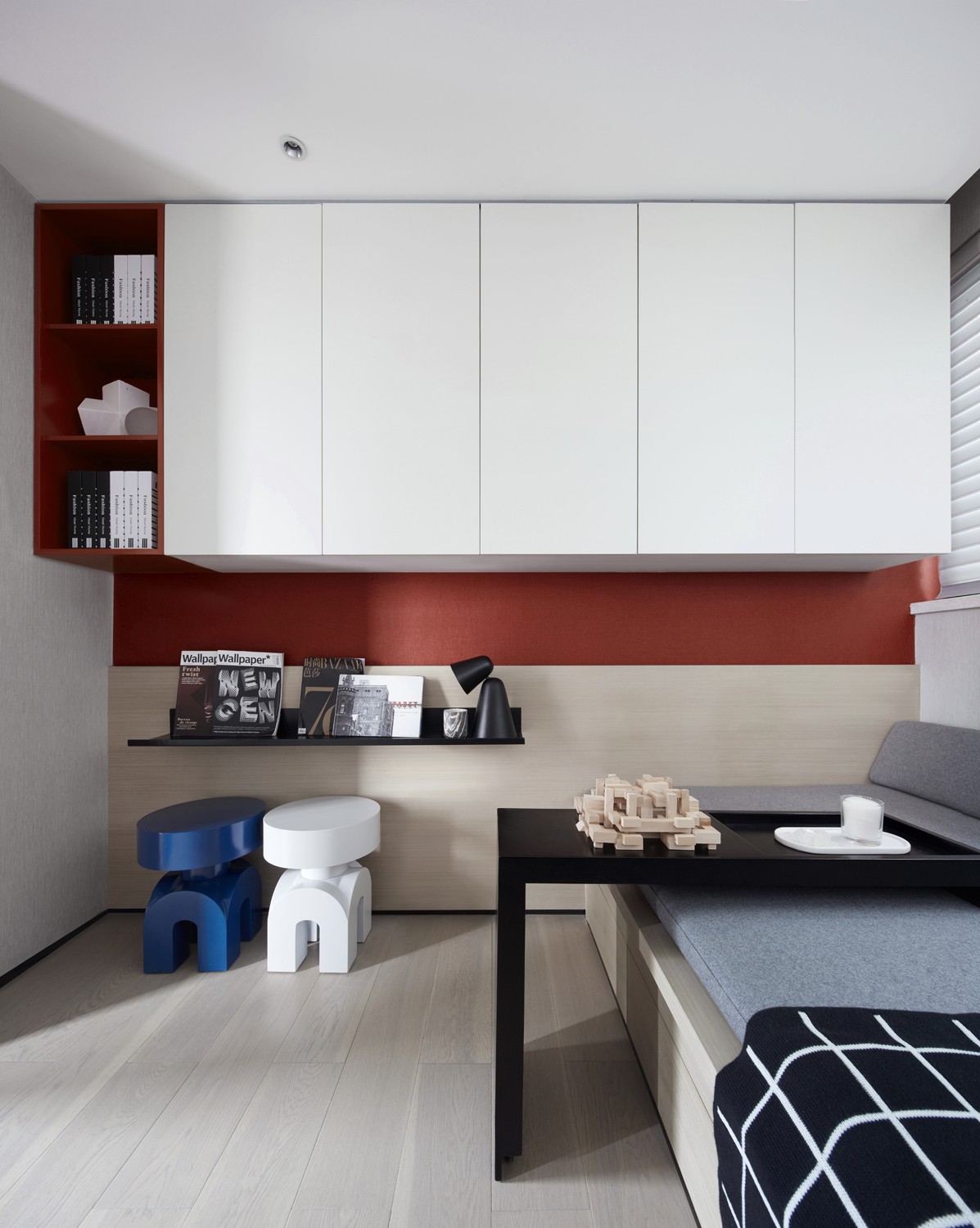 走進(jìn)臥室,仿佛踏入一方寧靜素雅的天地。與外面的多彩形成鮮明對比,這里以純凈的白色為主調(diào),營造出一種平和安寧的氛圍。紅黑底色的書柜和書桌,為這份素雅增添了一抹沉穩(wěn)與個(gè)性。窗戶是臥