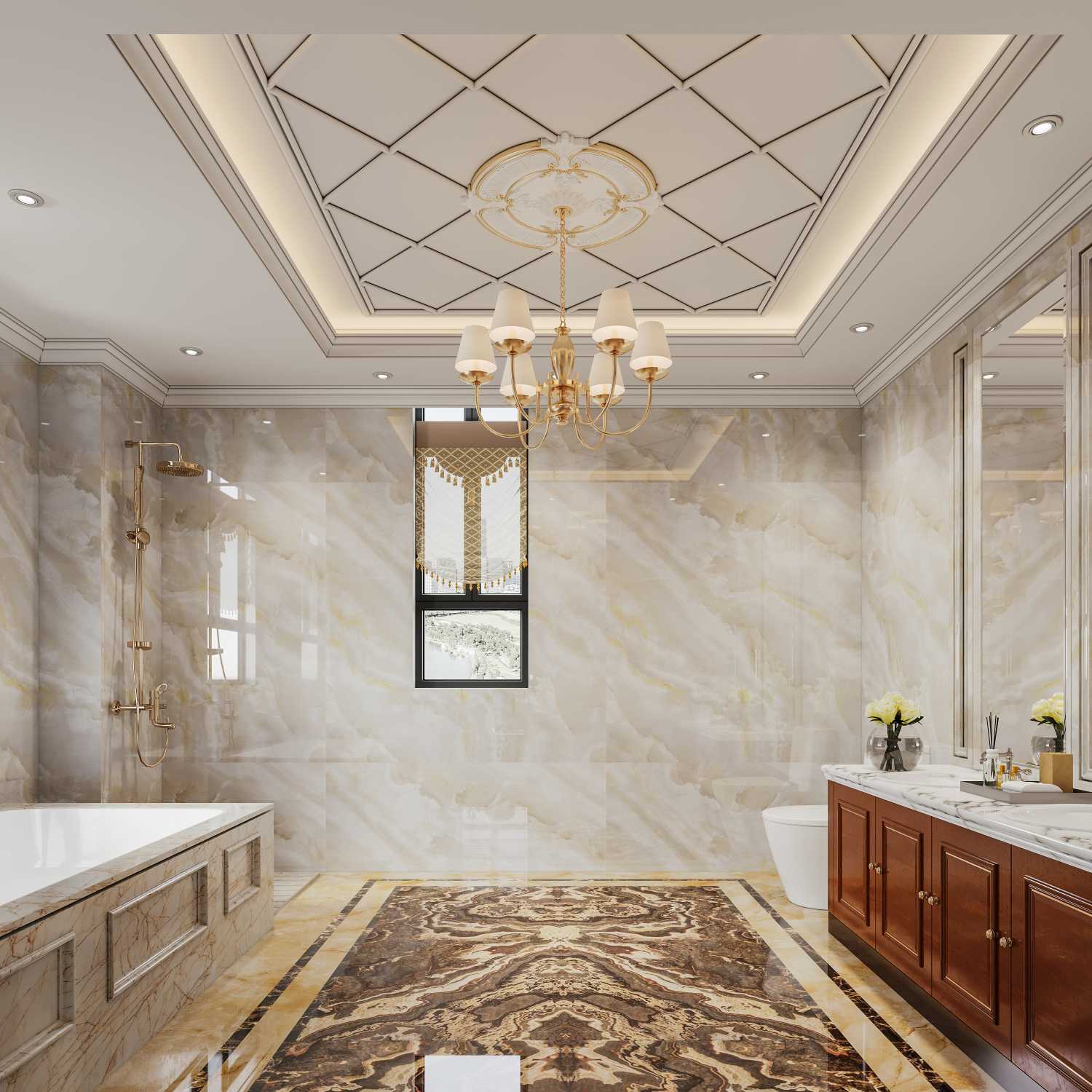 空間以米黃色大理石為主,色調(diào)溫暖柔和。吊頂幾何造型搭配金色裝飾,精致考究。金色吊燈與同色系衛(wèi)浴設(shè)施相呼應(yīng),簡約而不失奢華。浴缸、淋浴區(qū)分區(qū)明確,滿足多樣化洗浴需求,帶來愜意享受。