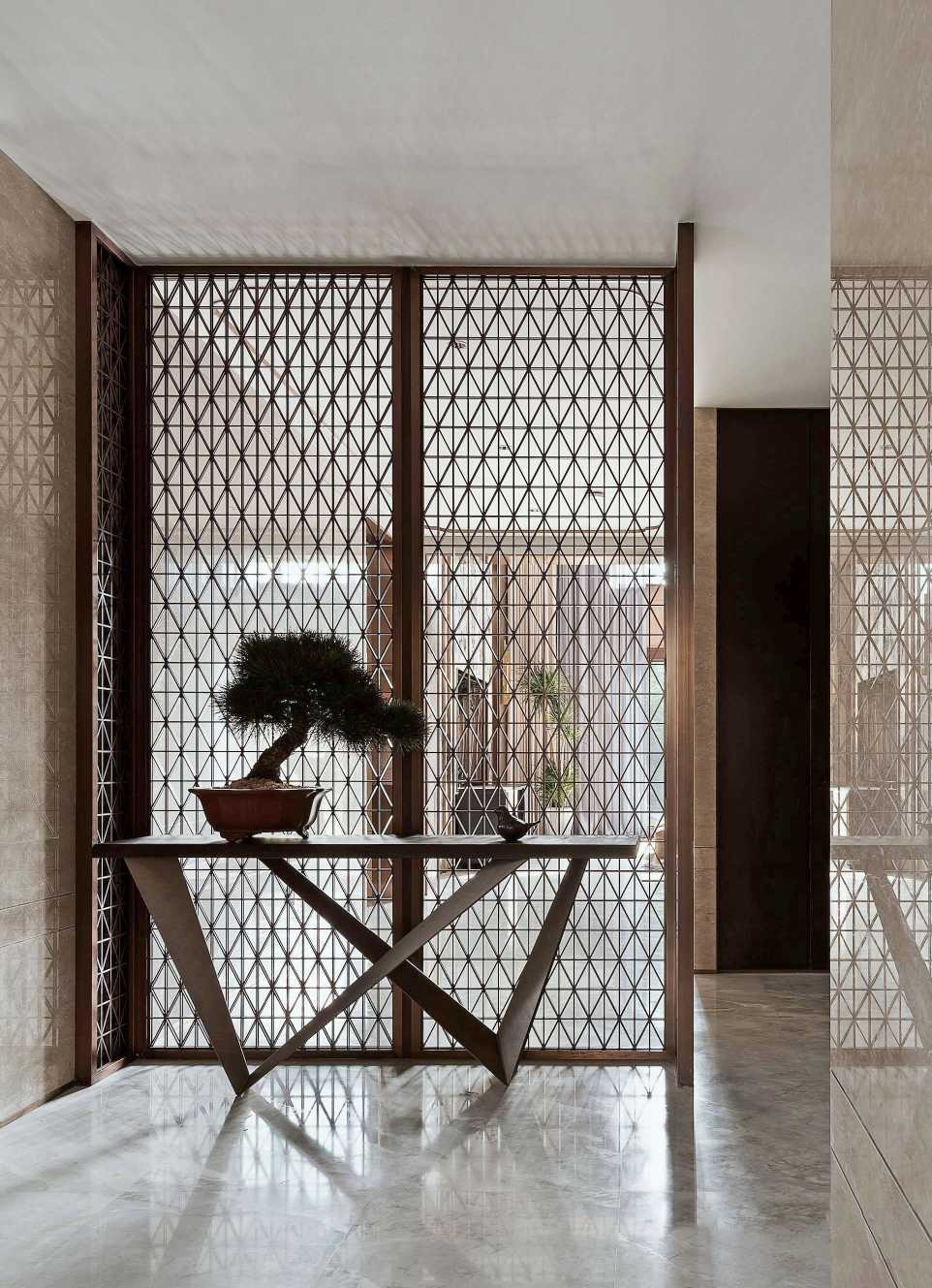 金屬幾何屏風(fēng)作為視覺焦點(diǎn),傳統(tǒng)與現(xiàn)代設(shè)計(jì)融合。淺米色墻面搭配大理石地面,簡(jiǎn)潔大氣。端景臺(tái)擺放盆景與藝術(shù)擺件,綠植生機(jī)與金屬冷感碰撞,營(yíng)造入戶儀式感。光線透過屏風(fēng)形成光影美學(xué),大連杰美裝飾裝修設(shè)計(jì)既劃分空間,又以雅致格調(diào)開啟歸家序幕。