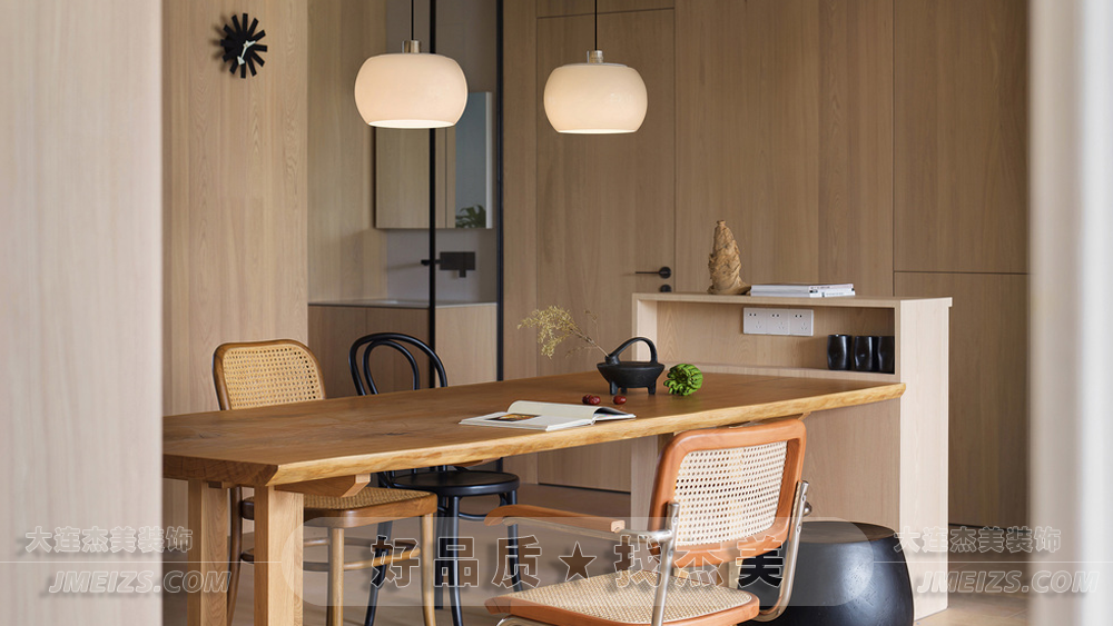 盡管原木元素在這個設(shè)計(jì)中占據(jù)了主導(dǎo)地位,但是現(xiàn)代簡約的風(fēng)格也同樣明顯。設(shè)計(jì)師通過簡潔的線條、明亮的色彩和功能性的布局,創(chuàng)造出一個既實(shí)用又美觀的空間。