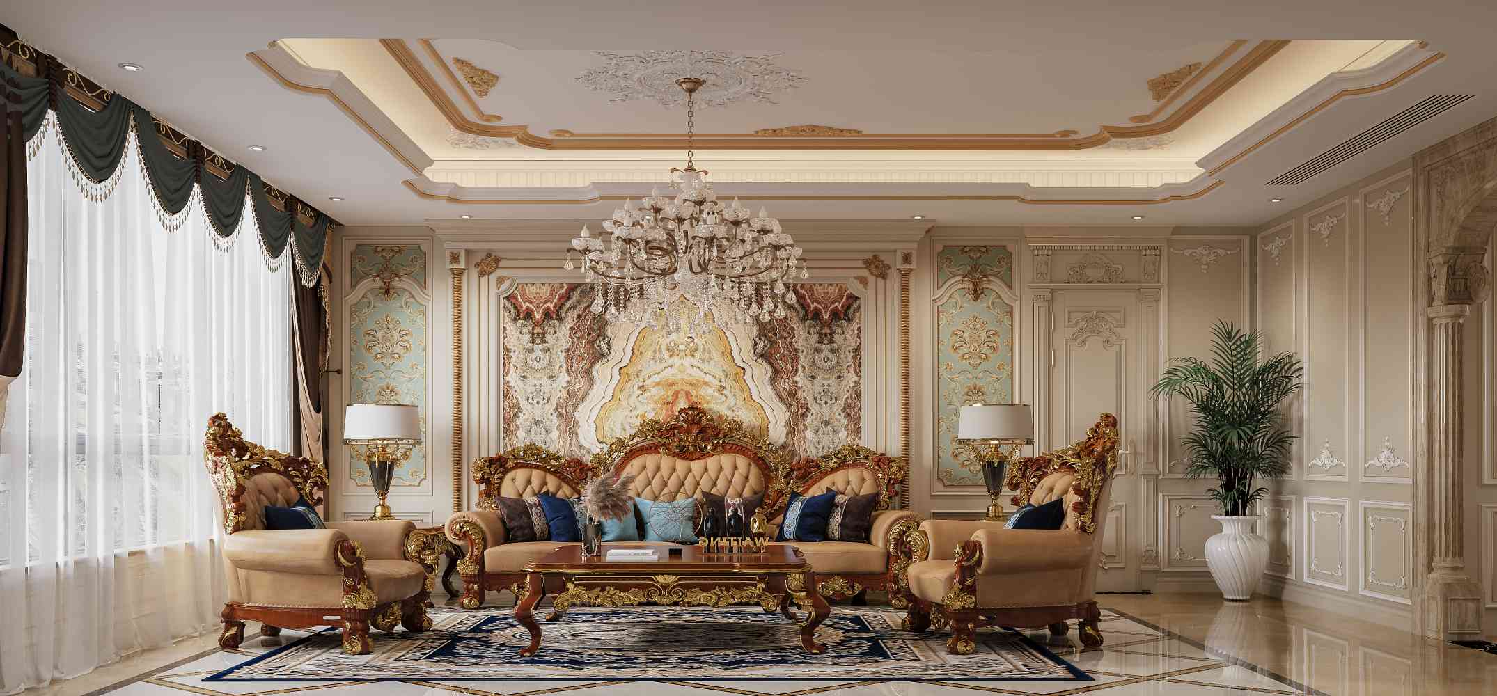 整體風(fēng)格奢華大氣,金色與米白色交織,營造出富麗堂皇之感。華麗的床頭造型、大型水晶吊燈與精美地毯,彰顯高貴品味。合理的空間布局,滿足休息、收納等需求,是放松身心的理想之所。